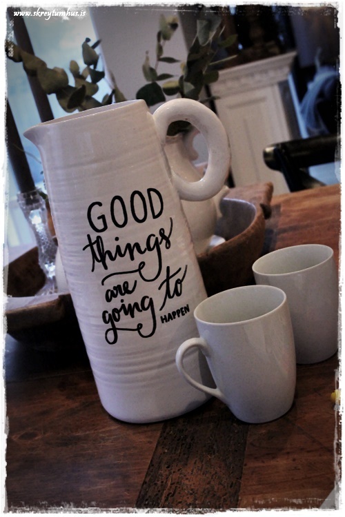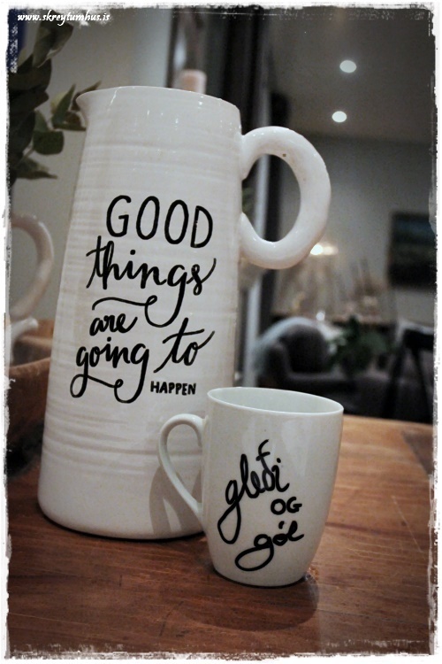 …en ég sé svoldið fyrir mér að ná að tvinna þetta saman, skrautskriftina sem ég læri af bókinni og að geta skrifað svona á könnur og allan slíkt. Svoldið svona eins og stóra fína kannan mín á myndinni, sem var að sjálfsögðu keypt með þessu á…