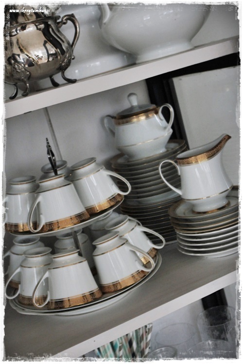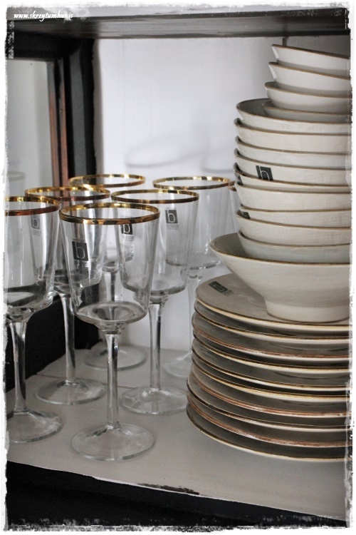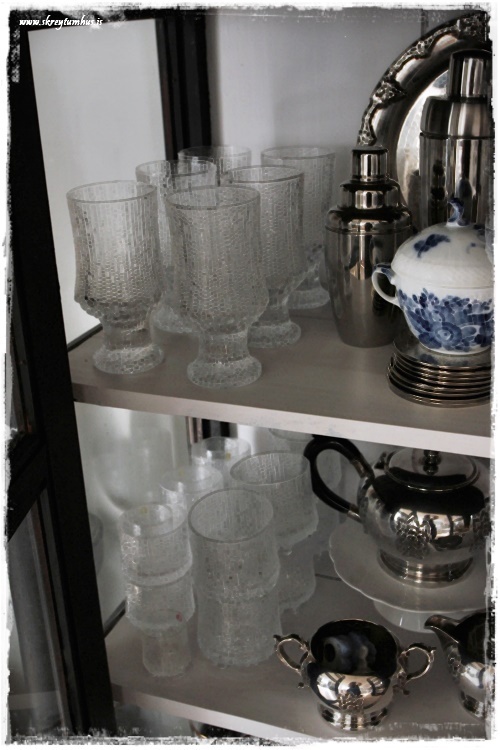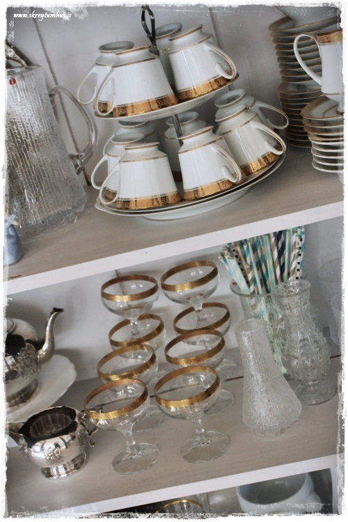 …eins og t.d. kaffistellið frá mömmu og pabba, og já – ég mæli með að geyma bollana á svona tvö- eða þreföldum diskum – sparar pláss. Eins og glösin með gyllingunni orðin um 55 ára og koma frá mömmu og pabba líka…