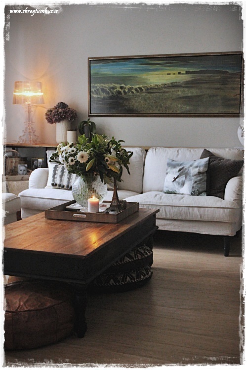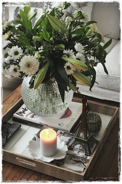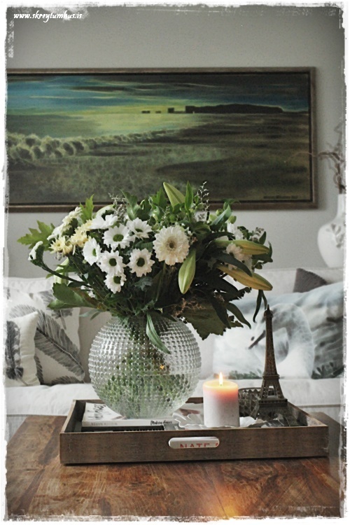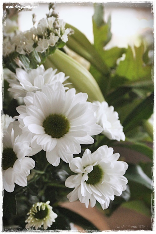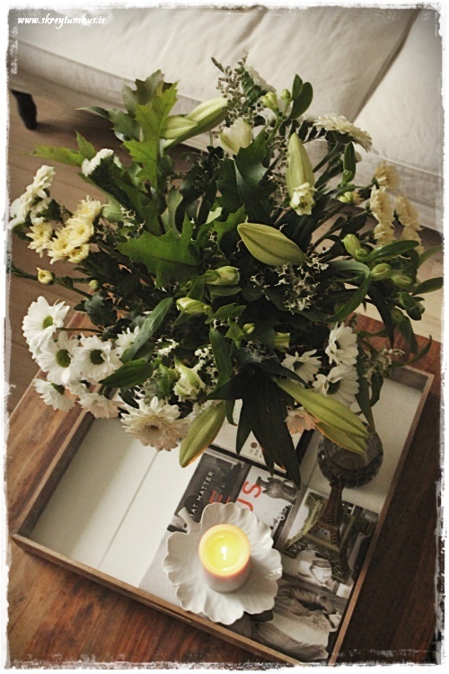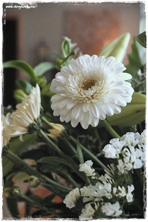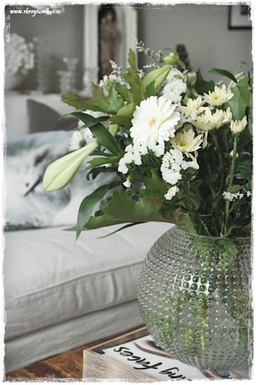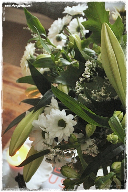 …ég fékk svo ótrúlega fallegan tilbúinn blómavönd í Blómaval. Settur saman með liljum, krýsum, mini gerberum, statiku og bara alls konar. En allt í svona fallegt og hvítt…