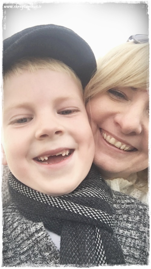 …gat ekki annað en brosað að syninum sem ég mætti á laugardagsmorgni í inniskónum sínum…