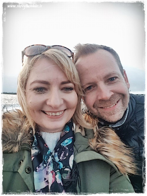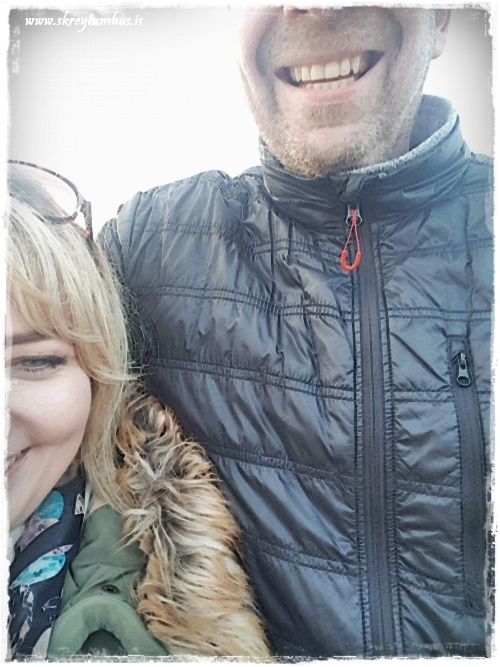 …ég var að hlægja að eiginmanninum, sem beygir sig alltaf þegar við tökum mynd af okkur saman…