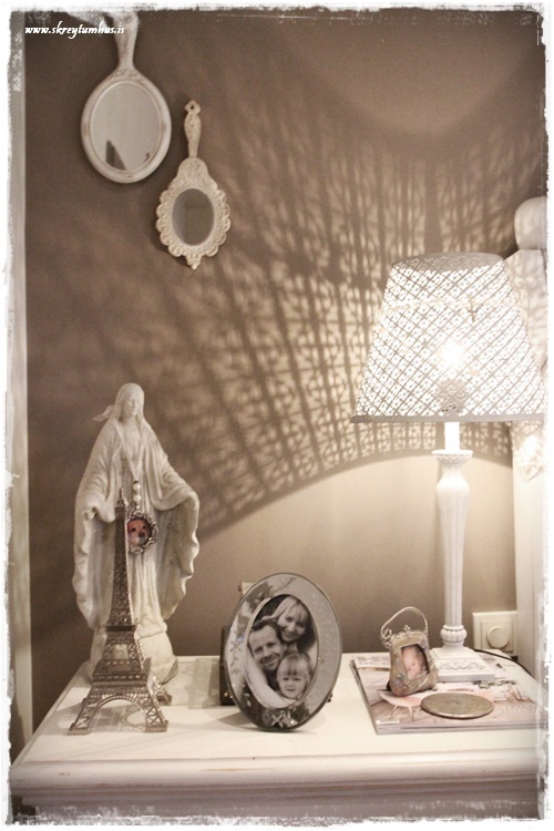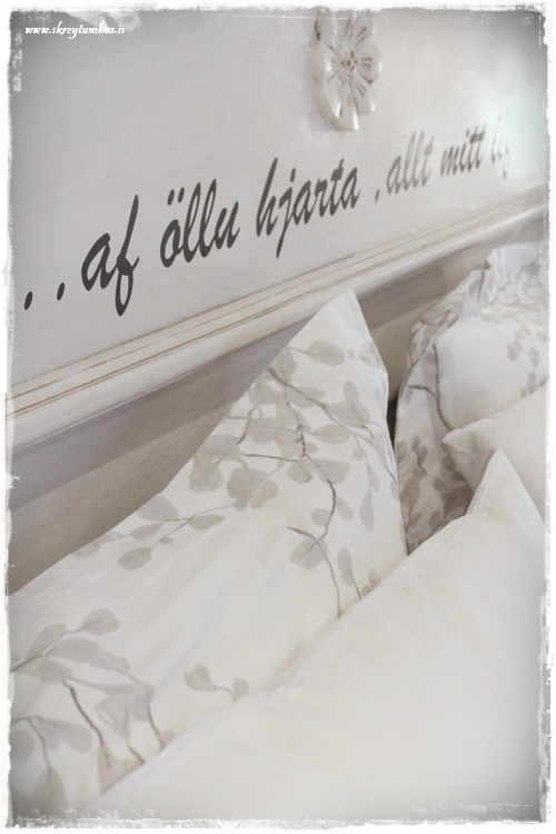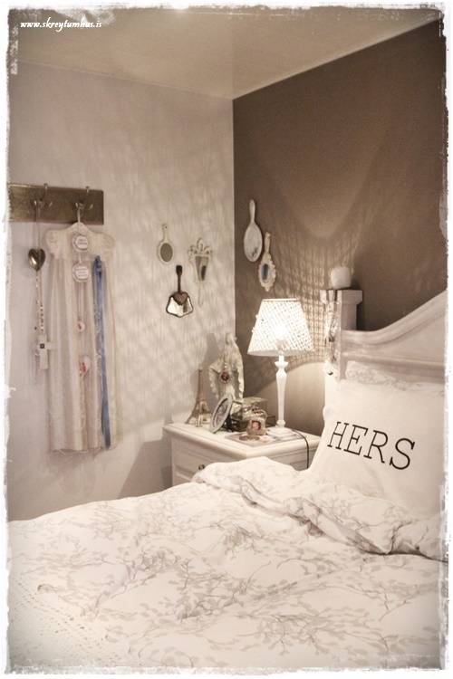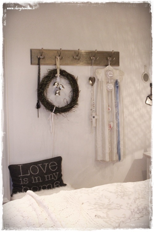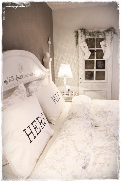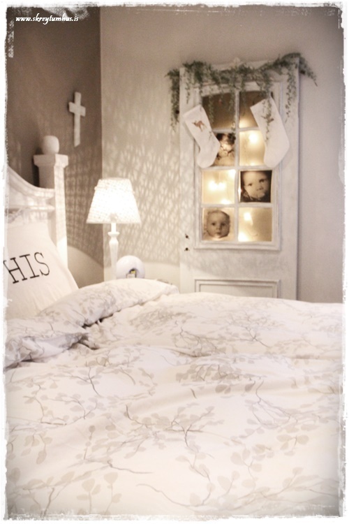 …og jú, reyndar er þarna smá gervigreni og tveir sætir jólasokkar, hvítir að sjálfsögðu.  Þið sem eruð síðan að velta því fyrir ykkur – þá er þetta hinn klassíski SkreytumHús-litur á höfðagaflsveggnum frá Slippfélaginu, hann er stundum mjög grár – stundum brúnni – en alltaf hlýr og fallegur – sjá hér...