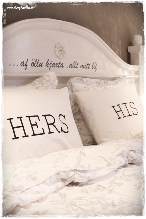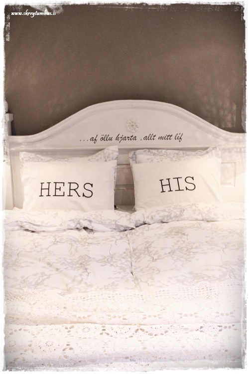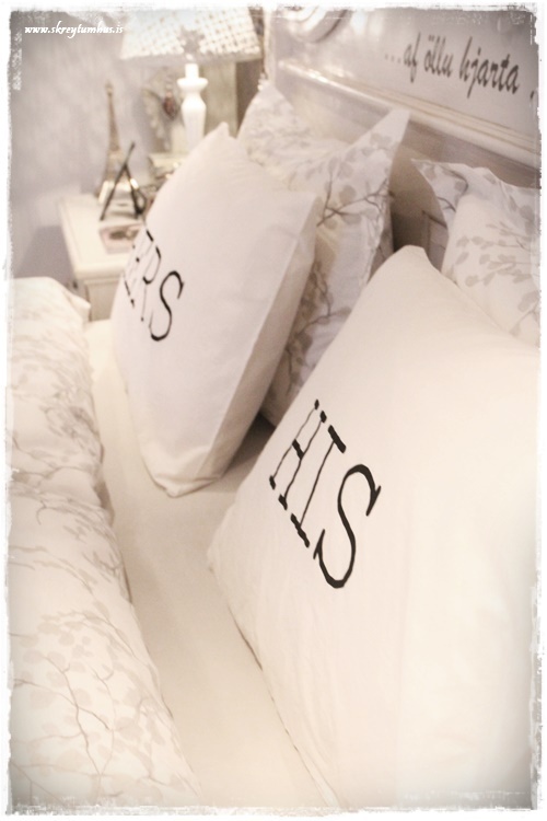 …ég notaði His og Hers-koddaverin í nýju Rúmfó-íbúðinni á Bíldshöfða og var búið að langa í þau síðan.  En þið voruð svo duglegar að þið keyptuð þau öll upp og ég fékk ekki neitt.  Svo loks fann ég þau í Rúmfó á Granda…