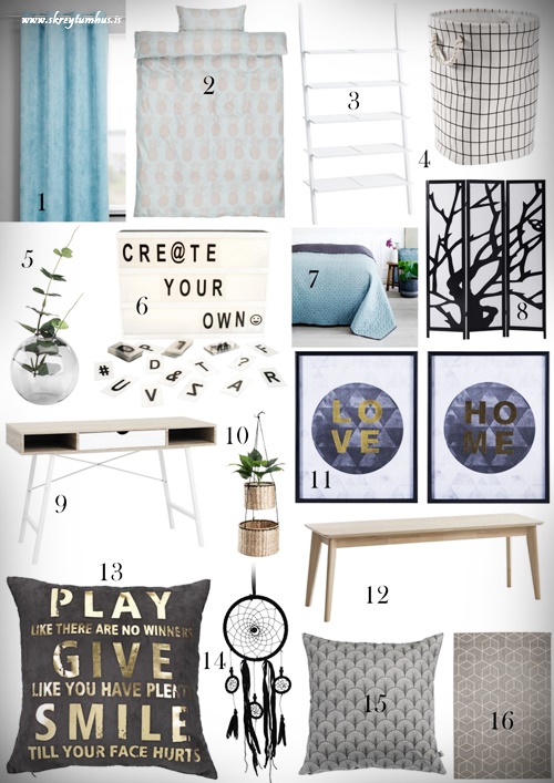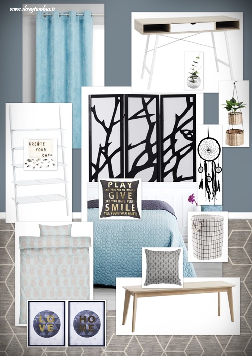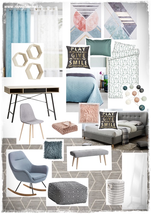 Hér er síðan mood-board fyrir herbergið, eins og þið sjáið það uppraðað hér að ofan…