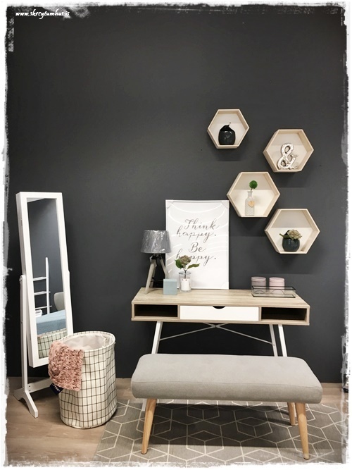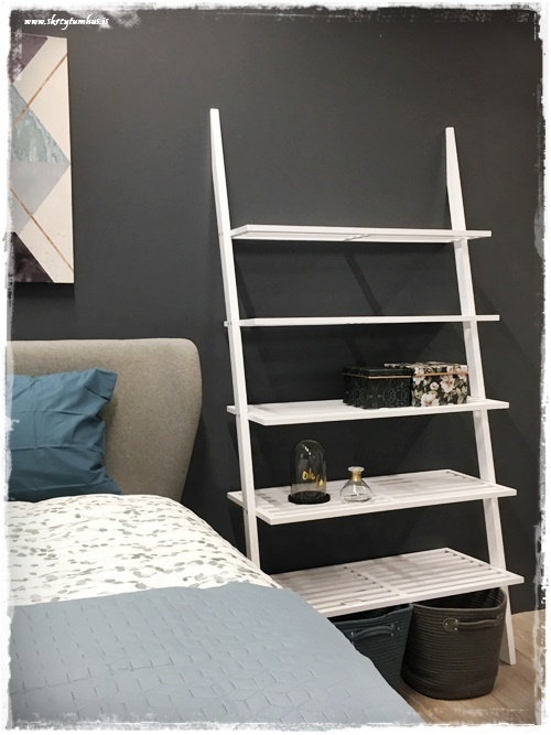 …og hér er hillan sem kemur svo fallega út á svona dökkum vegg, hún er svo opin og nýtur sín vel…
