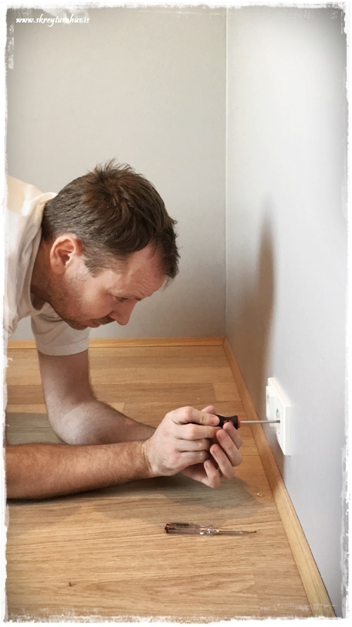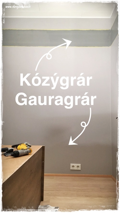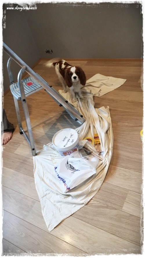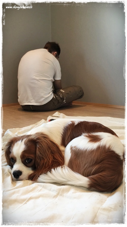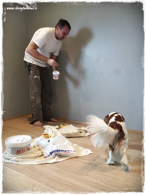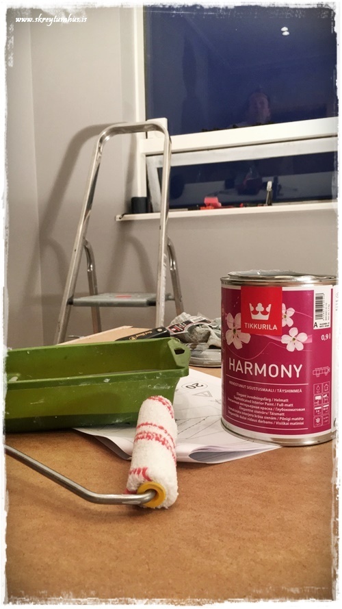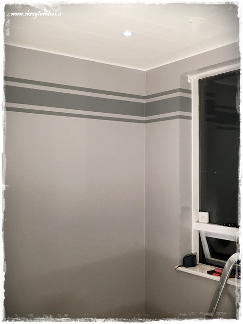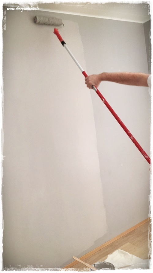 …svo var að mála með dökka litinum, og við völdum alveg matta málningu í Kózýgráum – sem er æææææði og einn af litunum sem er á 50% afsl hjá Slippfélaginu núna í febrúar…