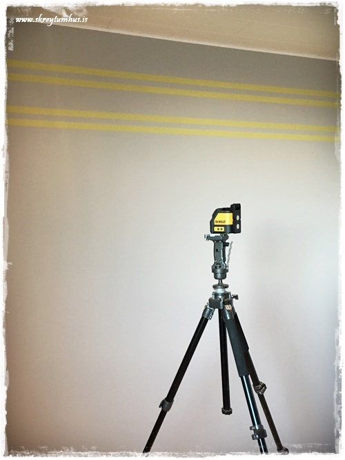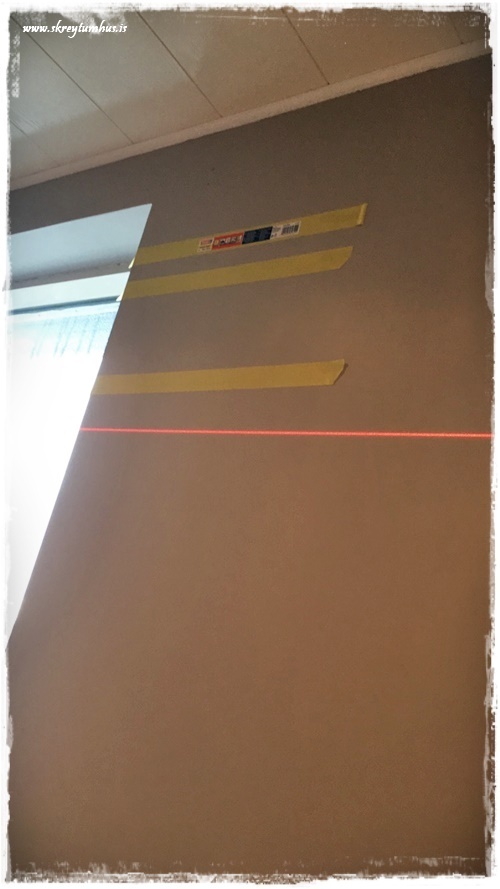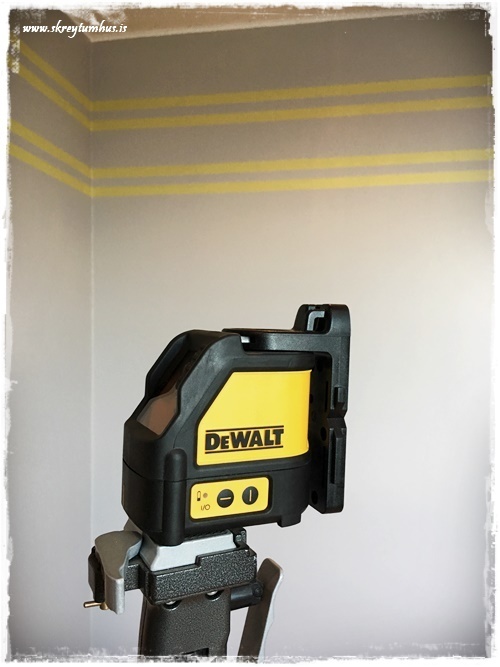 …og þegar þið skoðið myndina hér fyrir ofan, þá sjáið þið svona lazer-línu sem við notuðum til viðmiðunar þegar við festum límbandið og þetta er snilldargræja. Við erum búin að eiga þetta í mörg ár og notað mikið, en ég fann sambærilegt hjá Húsasmiðjunni (smella)…