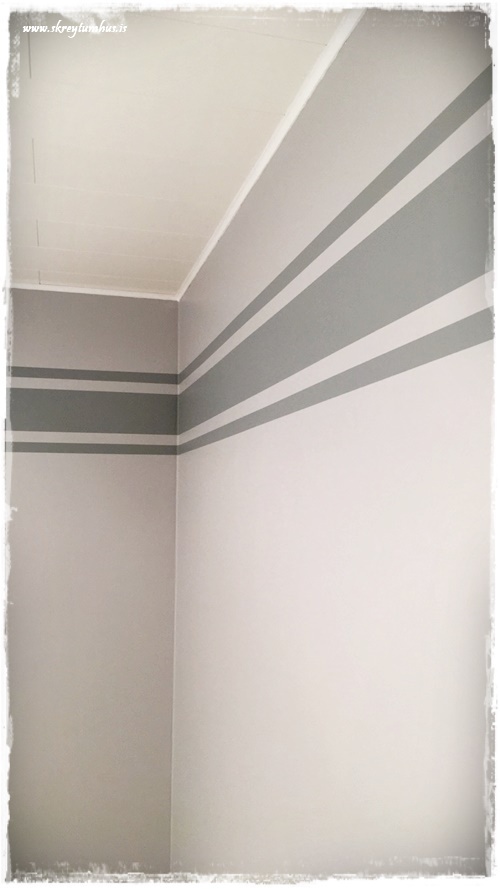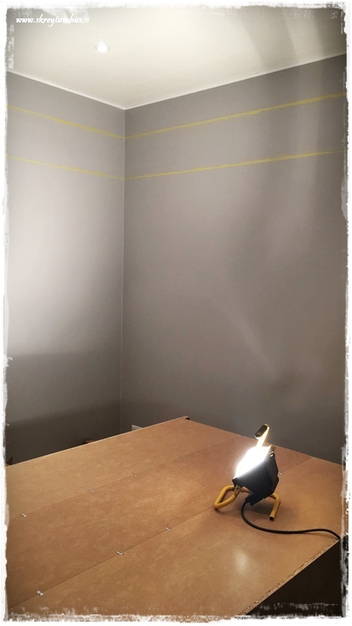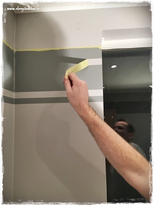 …við byrjuðum að setja límbandið við gluggann, því að það er gott að sjá hvernig þetta kemur út við hann. Eins er gott að spá hvernig línurnar hitta á hurðina í herberginu…