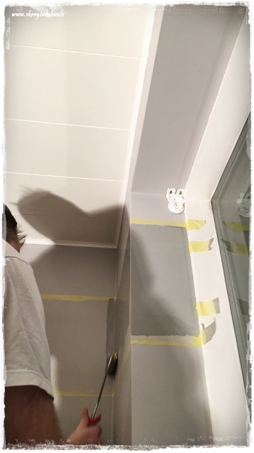 …við fórum bara eina umferð, enda var þetta rúllað með lítilli rúllu og farið vel yfir, þannig að þá var bara að taka límbandið af. Best er að gera það áður en málningin þornar…