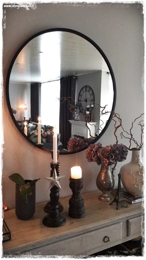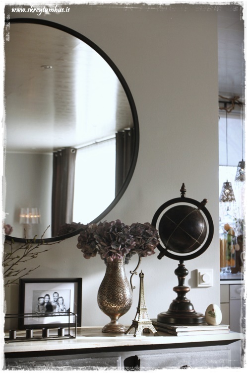 …þannig að eftir miklar pælingar og spökuleringar, þá ákvað ég að fá mér bara hringspegil á vegginn. Ég skoðaði á ansi mörgum stöðum, en að lokum var það Hub-spegillinn frá Esja Dekor sem heillaði mest, sérstaklega út af svarta kantinum sem er allt í kring. Ef þið viljið skoða nánar, þá er hægt að smella hér og kíkja á….