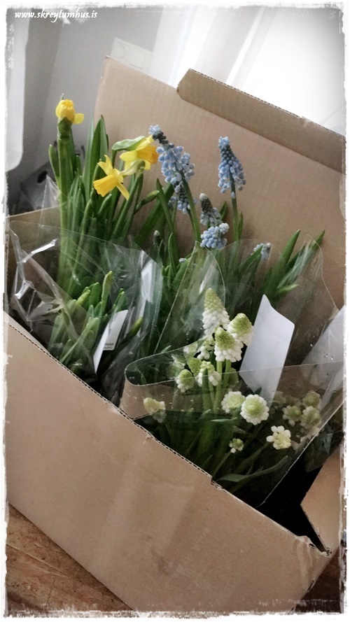 …öll þessi dásemdar vorlaukar eru í uppáhaldi, Perlulilja (Muscari í potti), bæði í bláu og hvítu. Svo tók ég bara svo grófa leirpotta með, þeir eru líka vorlegir í hausnum á mér…