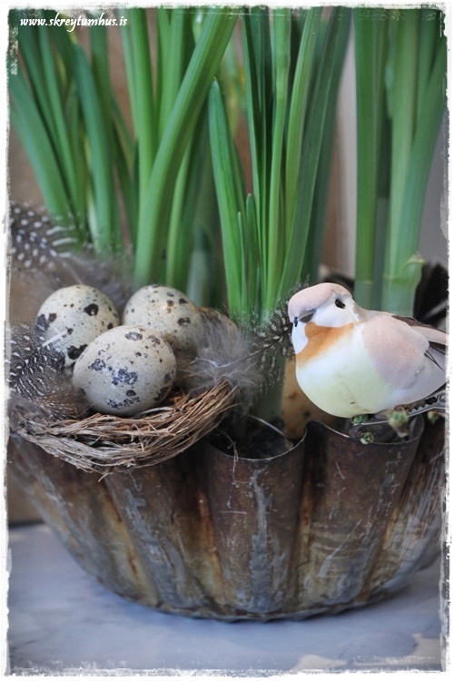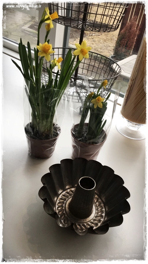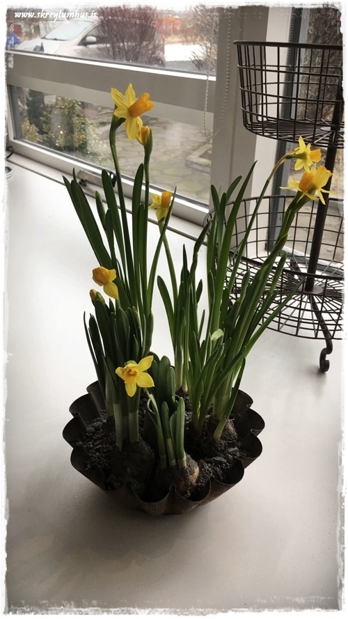 …svo fékk ég mér litlar páskaliljur (Tété í potti) og ákvað að taka þær í sundur og setja í gamalt kökuform…
