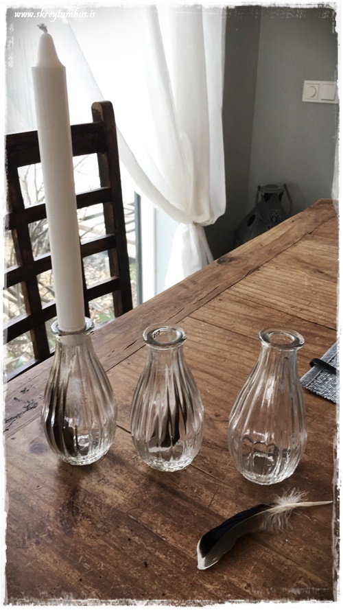 …ég setti síðan fjöður ofan í hvern vasa, og setti kerti – þannig urðu þeir að kertastjökum…