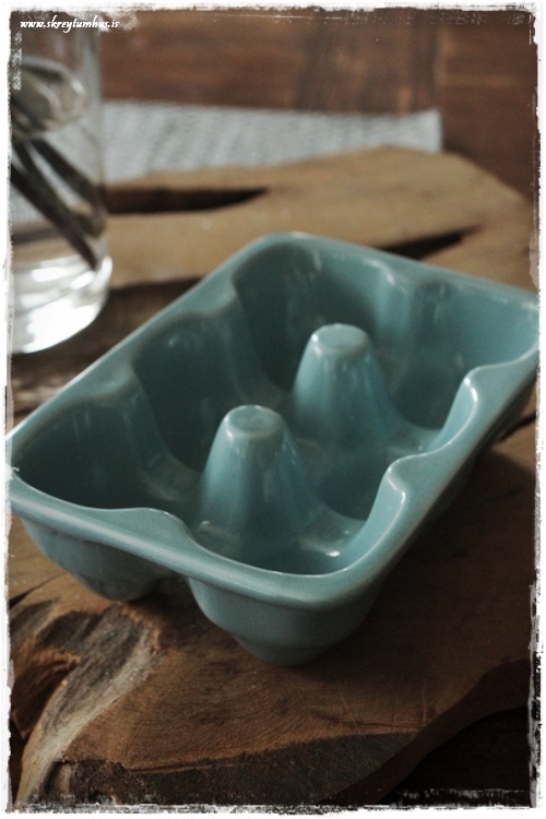 Eitt af því sem mér fannst æði eru þessi litlu postulínseggjabakkar – þeir komu í bláu, grænu og bleiku. Ég tók þann bláa…