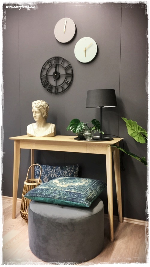 …ég valdi síðan hliðarborð sem er í stíl við borðstofuborðið, og fyrst setti ég þrjár klukkur á vegginn…