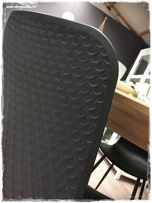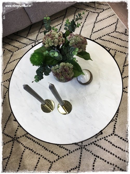 …eins finnst mér borðið alveg ferlega flott, en það er marmara-áferð öðru megin og hinum megin er eik – sem sé svona tvö borð í einu…