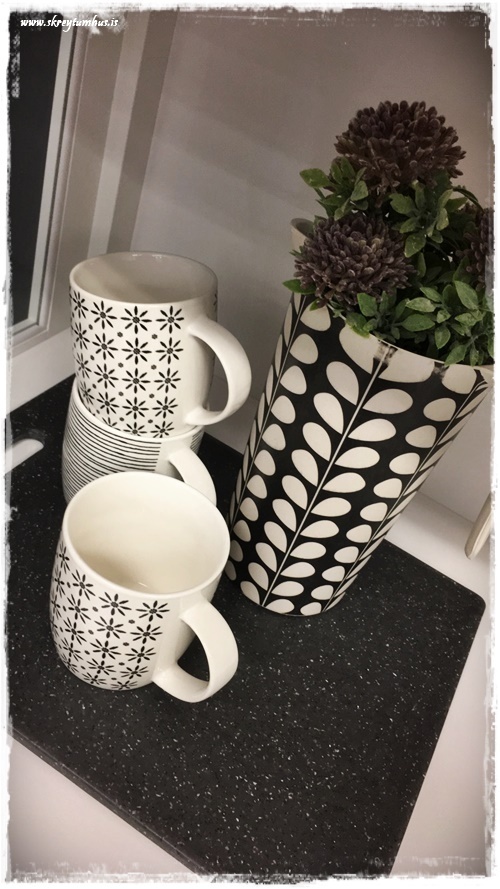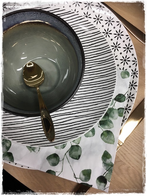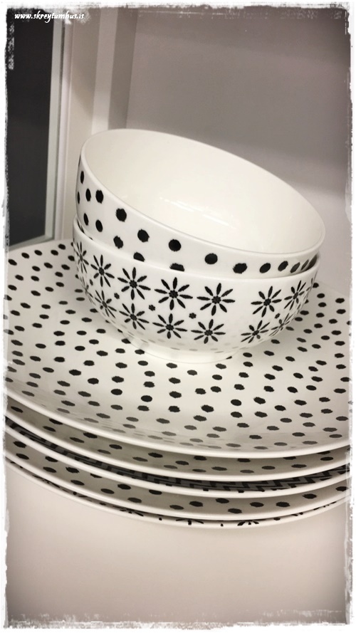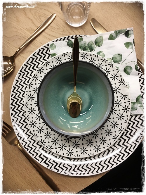 …og svo litlu skálarnar og blanda þeim með hvítu/svörtu mynstruðu diskunum, og gefa þeim lit – ásamt servéttunum…