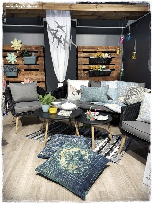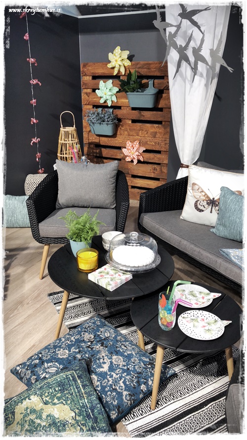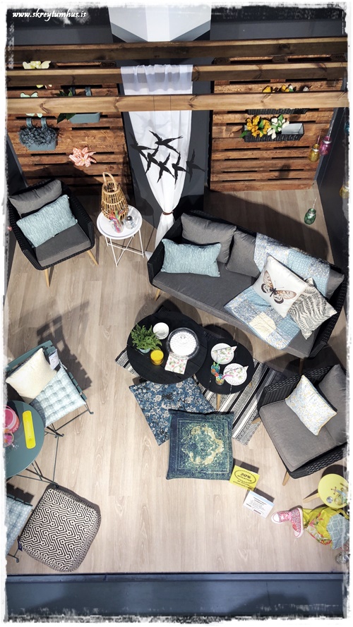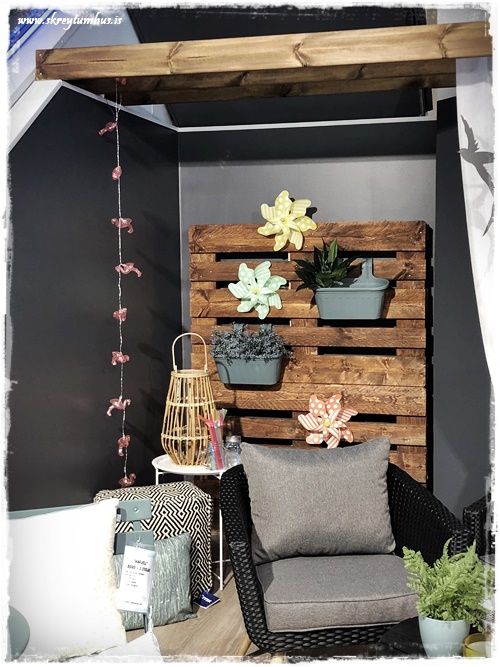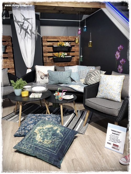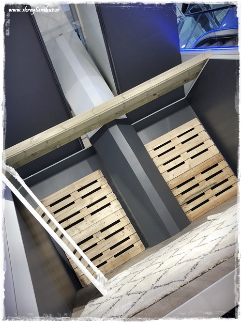 …hann Ívar “minn” í Rúmfó á Bíldshöfða bað mig núna á dögunum að setja upp smá útisvæði hjá þeim í búðinni. Það sem meira er, útisvæðið er inni. Þannig að við fórum í smá pælingar um hvernig væri skemmtilegast að gera þetta, og ég fékk þá hugmynd að setja bara upp tvær pallettur, ofan á hvor aðra og veggfesta þær. Þannig fengum við svona smá “útipalla”-fíling upp á sýningarpallinum. Eins settum við þverspýtur til þess að fá smá svona pergóla-look á þetta…