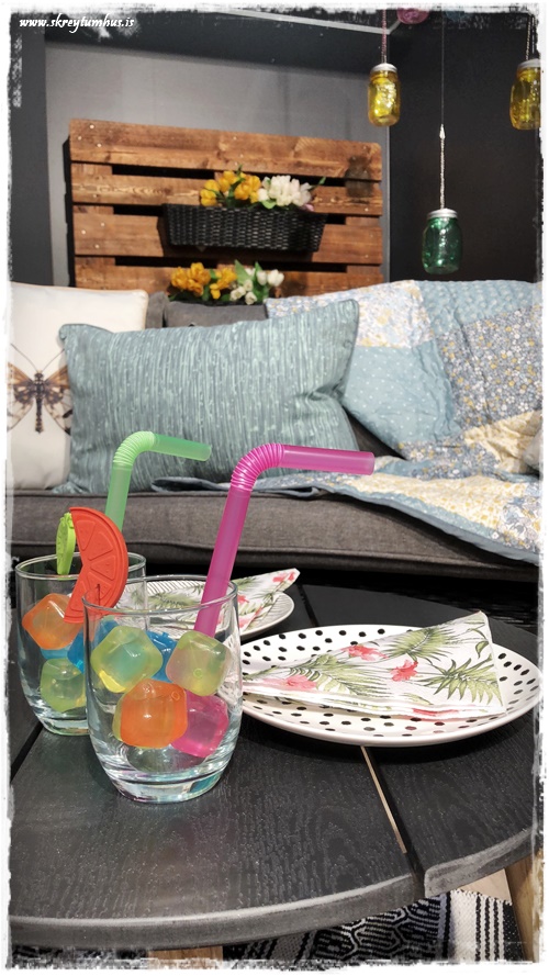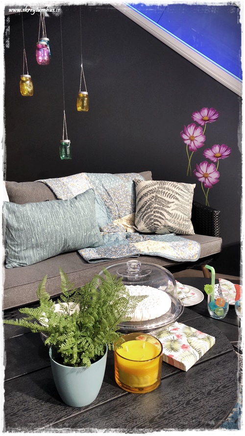 …límmiðarnir á veggnum eru seldir sem ruslatunnuskreytingar, en mér fannst þeir bara sætir svona sem vegglímmiðar. Eins er stemming í kertaluktunum sem hanga þarna í nokkrum sumarlitum…