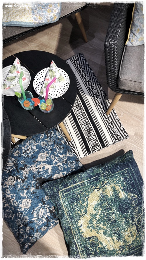 …mér fannst einmitt svo gaman að sjá að þótt að settið sé svart með gráum sessum, og veggirnir dökkgráir, þá náðum við samt litagleði inn og sumarfíling…