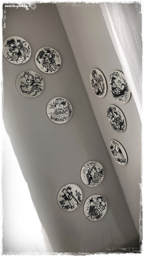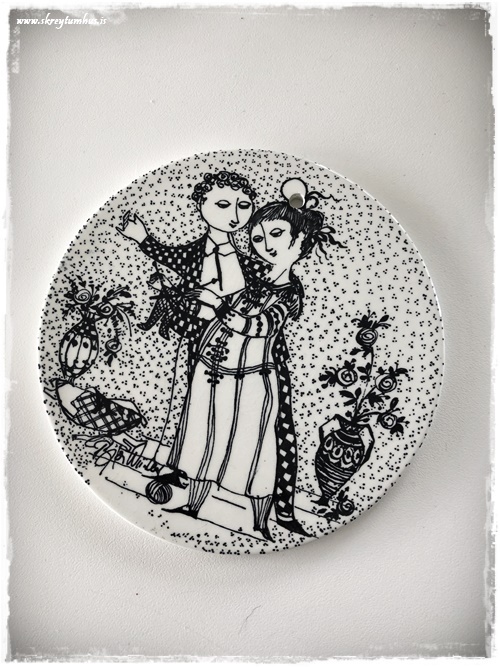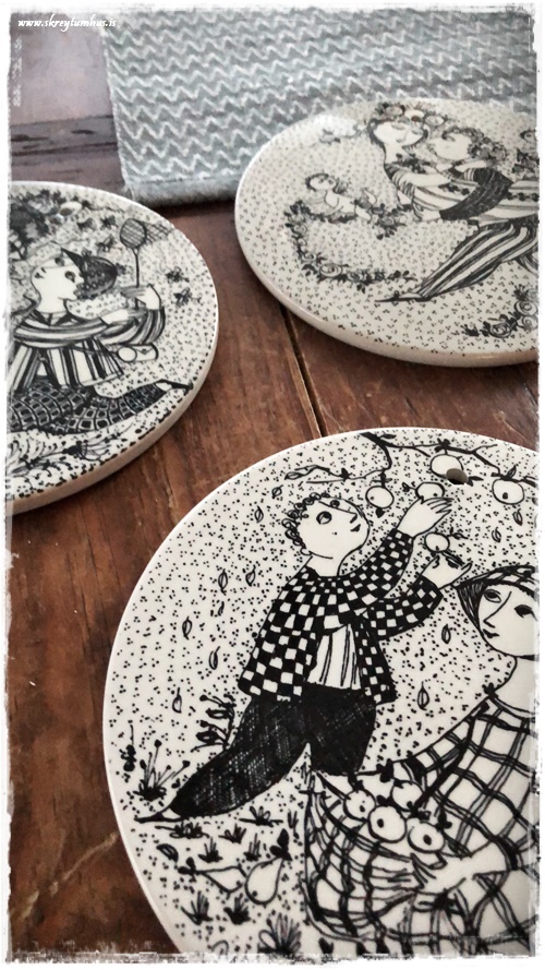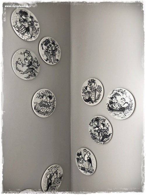 Þeir eru eftir listamanninn Bjorn Wiinblad (1918-2006). Ég keypti fyrst bara fjóra, en bætti svo tveimur við.  En serían eru 12 plattar sem segja ástarsögu, byrja í janúar og enda með barni í desember…