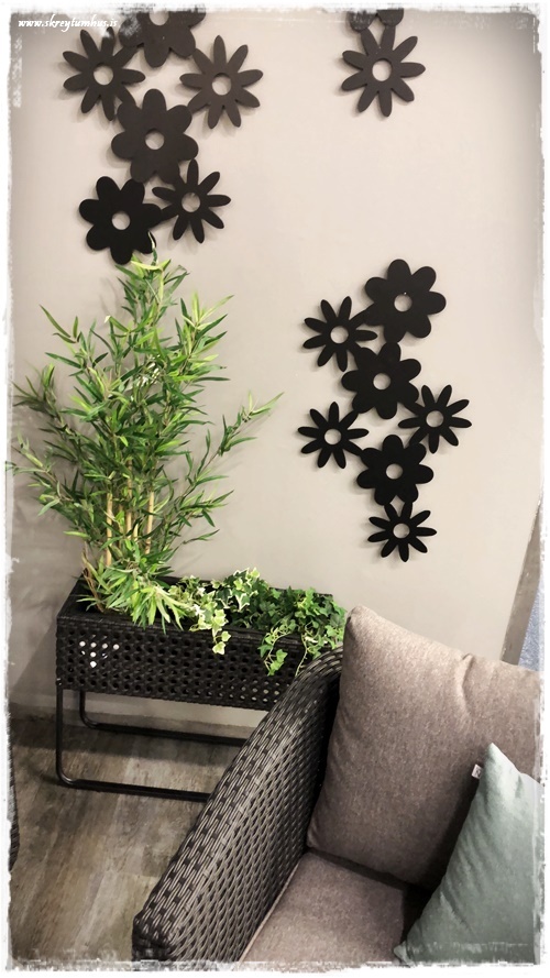 …mér fannst líka mjög skemmtilegt að nota blómin á veggina (koma líka fuglar og fiðrildi). Þetta er reyndar heldur ekki ætlað til þess að vera utanhúss en gæti eflaust gengið – væri kannski sniðugt að spreyja til þess að vera frá ryði…