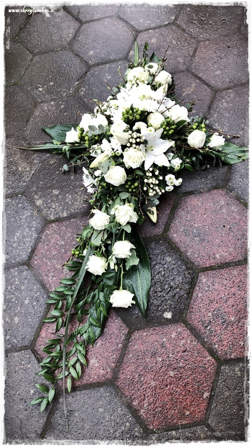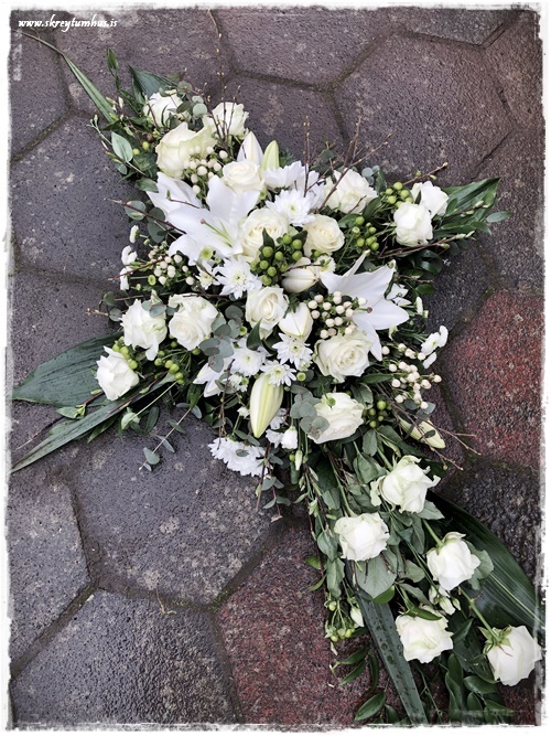 …hér sést síðan kistuskreytingin úti, en eins og þið sjáið kannski þá er útbúinn kross úr blómunum, sést kannski ekki nógu vel á þessi mynd…