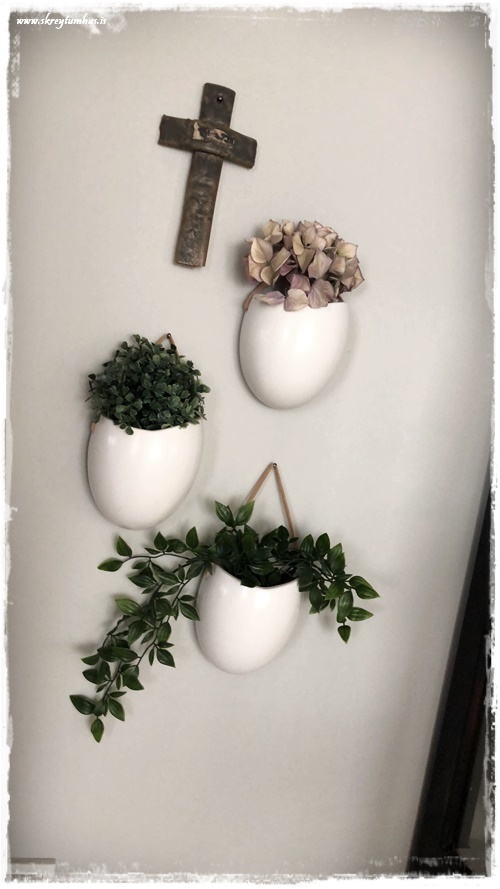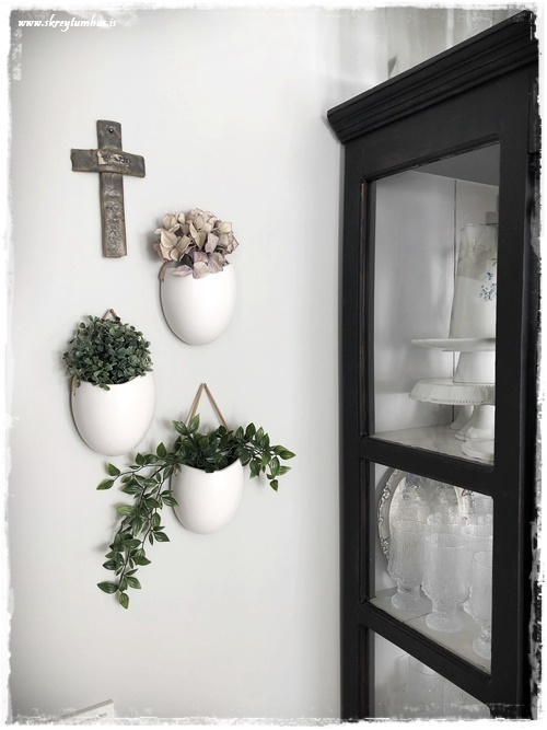 …í efsta pottinum er þurrkuð hortensía, svo er gamalt plastblóm sem ég hef átt lengi og í neðsta er gerviblóm frá Ikea sem ég klippti til. Þær sem eru súper glöggar telja eflaust til að þarna eru bara 4 naglar notaðir en ekki allir 5. Ég lét bara hengiblómið fara fyrir einn naglann, þannig að hann sést ekki lengur, en þó enn til staðar…