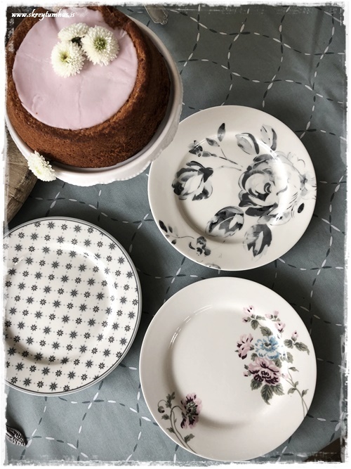 …smá búðarkaka verður mun fallegra ef maður skellir á hana nokkrum blómum – og já, þessi diskur er úr Litlu Garðbúðinni, en sennilegast orðinn í það minnsta 5ára!