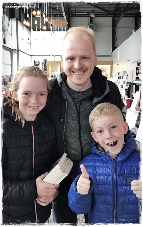 …svo þegar við fórum að borga, þá mættum við Ævari sjálfum, og hann var svo elskulegur að spjalla við krakkana og árita bækurnar þeirra. Ég held að þið sjáið alveg að þessi óvænti hittingur sló alveg í gegn…