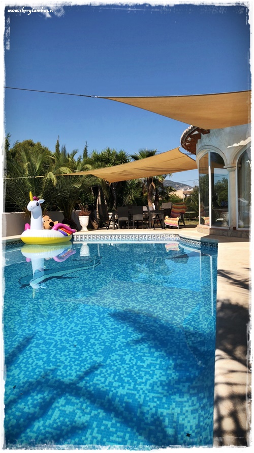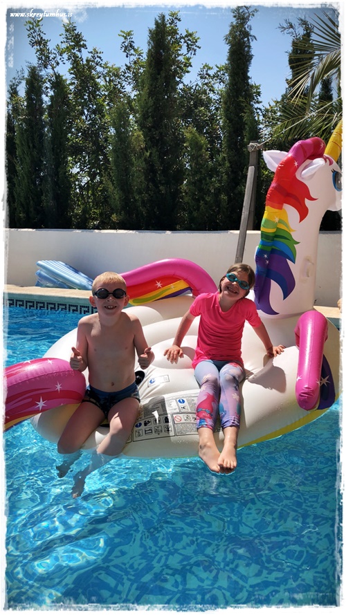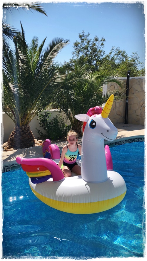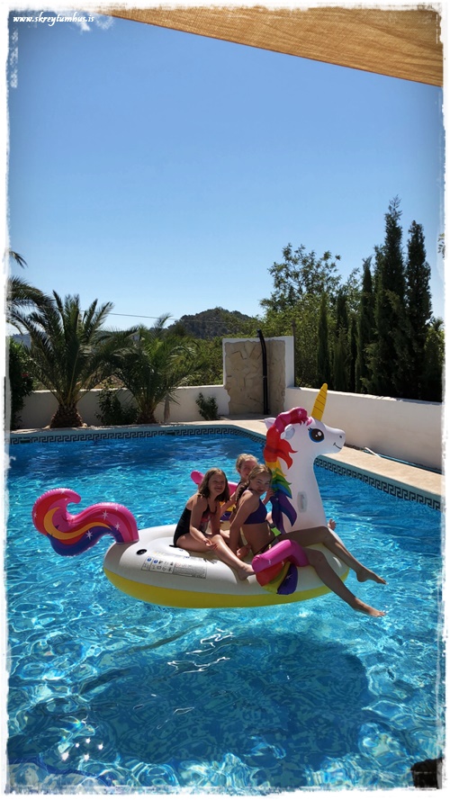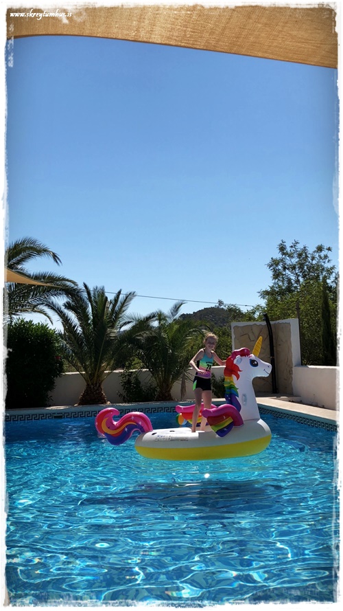 …við komumst fljótt að því að það er alveg magnað dýralífið þarna á Spáni, og fljótlega bættist einhyrningur í laugina – auðvitað 🙂