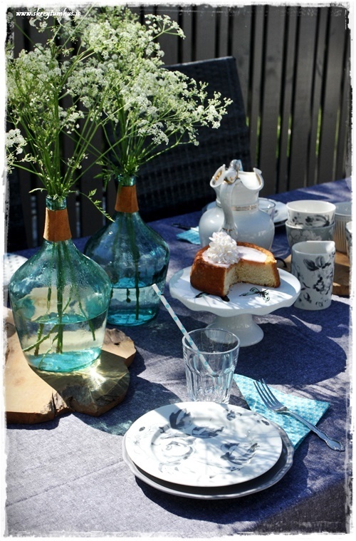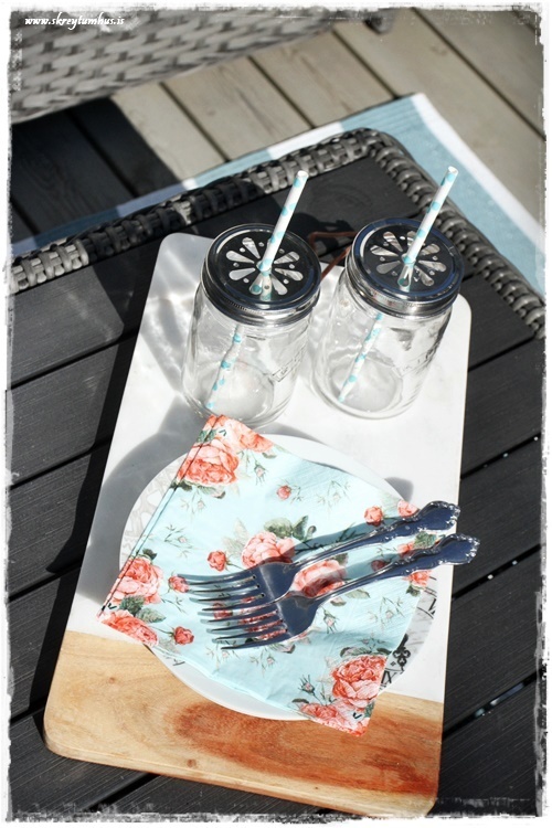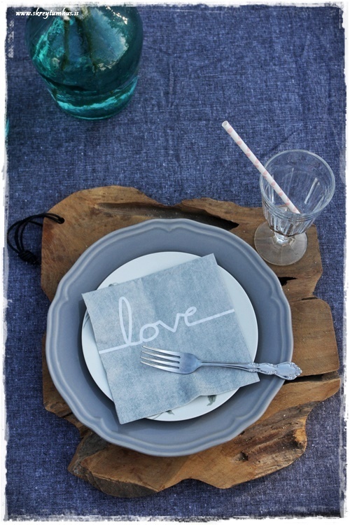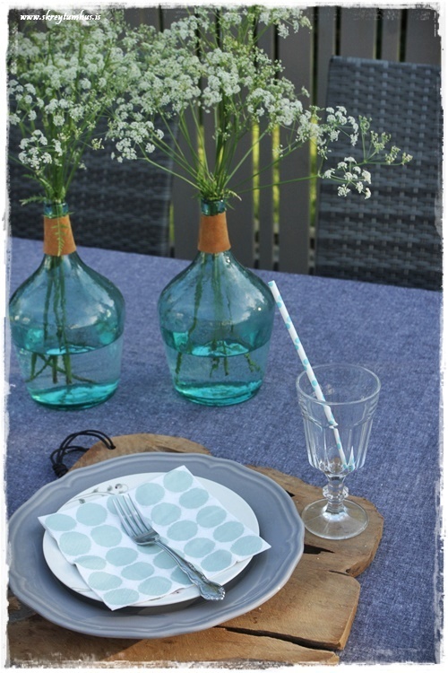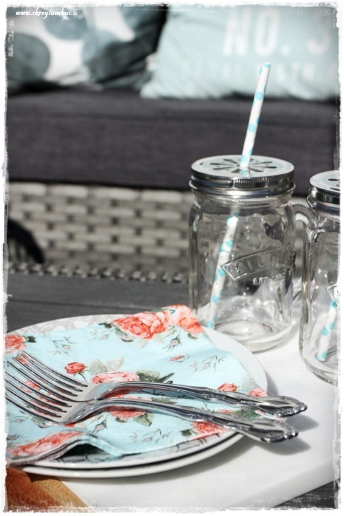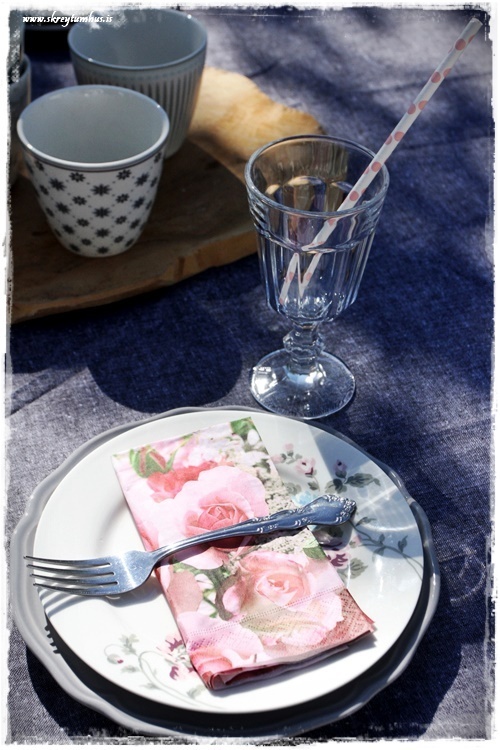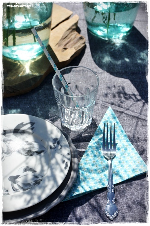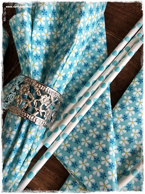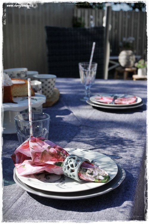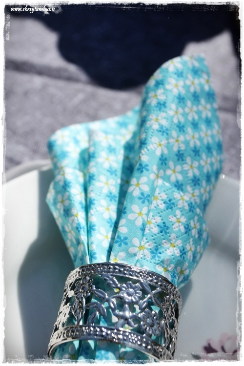 …þessar bláu servéttur fannst mér æðislegar, svo mikið sumar í þeim og með servéttuhringunum, þá vorum við alveg að tala saman…