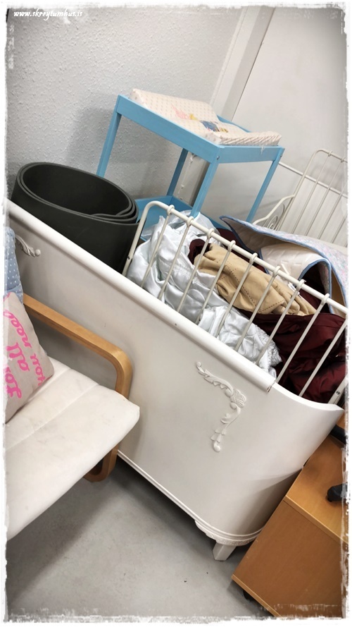 …svo fallegt hjónarúm, þið verðið bara að líta fram hjá dótinu sem er í kringum það og ofan á því – og það voru meira segja náttborð þarna í stíl, reyndar ómáluð…