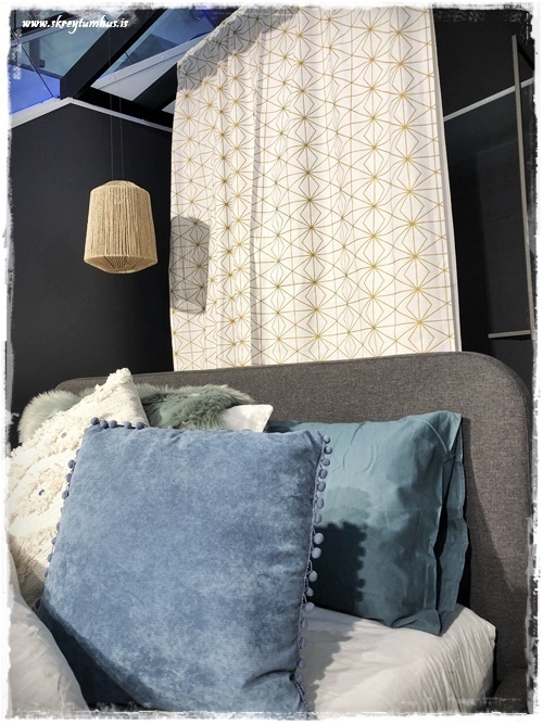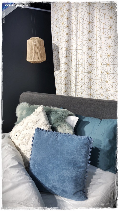 …á bakvið rúmið hengdi ég síðan efnisstranga, og þetta er t.d lausn sem er sniðug í svefnherbergi þar sem ekki er rúmgafl…