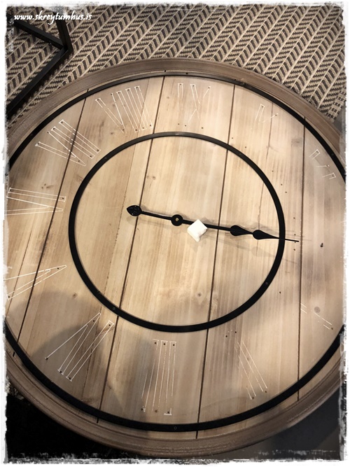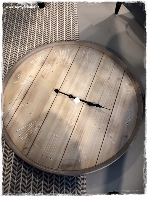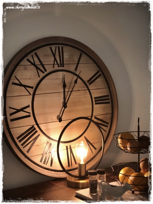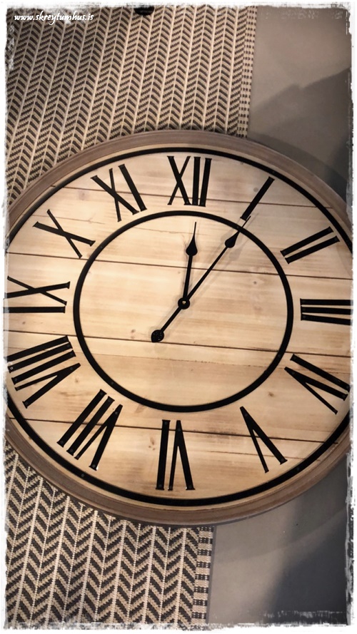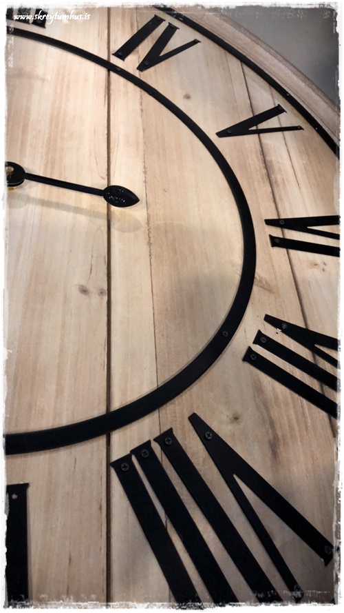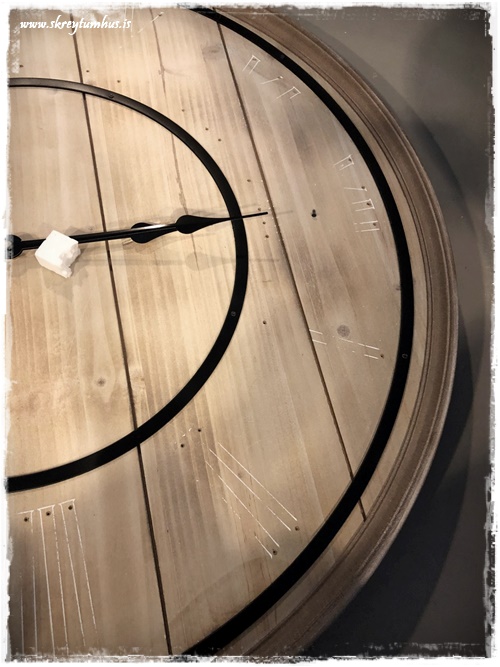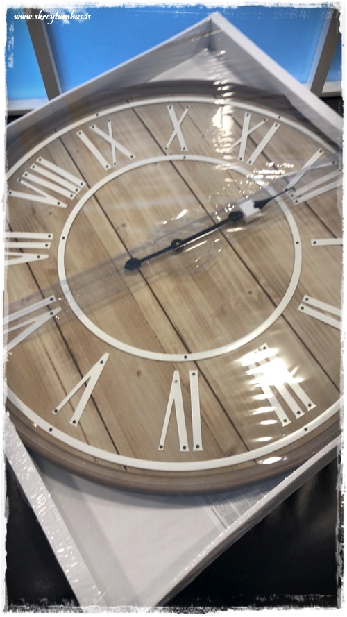 …ég var að vinna verkefni um daginn, og þurfti að finna klukku inn í rýmið. Ég var að leita eftir við, til þess að fá hlýleika, og svo ætlaði ég að hafa svart með – þannig að ég var búin að leita víða þegar ég rakst á þessa hérna í Rúmfó. Hún var á tilboði og kostaði um 6þús, og uppfyllti það sem ég þurfti NEMA hún var með hvítum stöfum…
