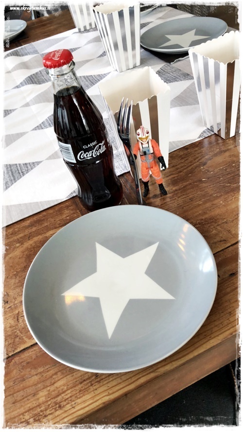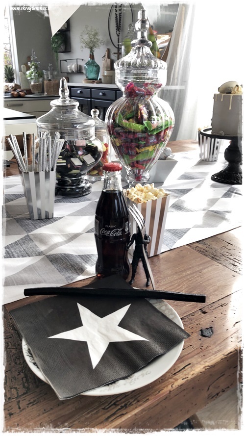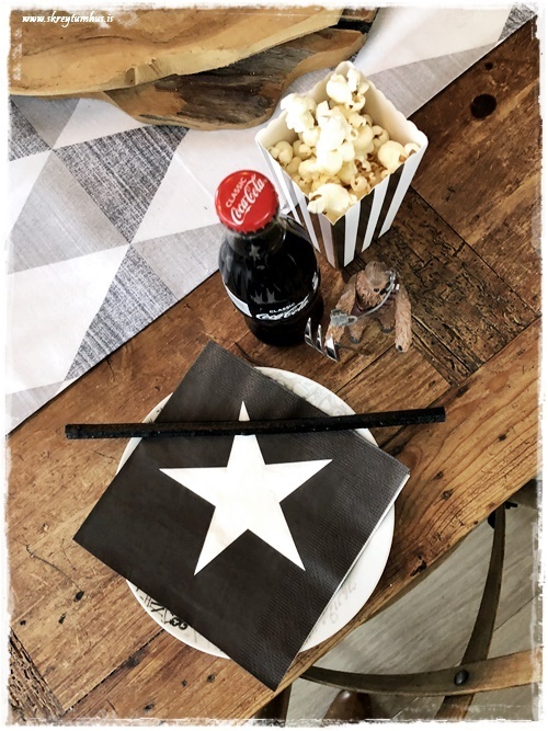 …síðan notaði ég diska sem ég átti, gamlir úr Rúmfó, og þar sem ég átti ekki nógu marga þá var ég bara með hvíta diska á móti – og á þeim voru svartar servéttur með stjörnu líka. Drengurinn fær ekki gos að staðaldri, og það var því mikið sport að fá að vera með kók í gler – og það kemur alltaf skemmtilega út. Sérstaklega þegar hann vildi hafa svart…