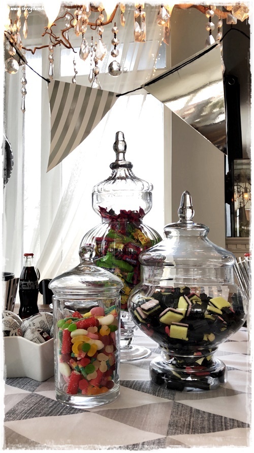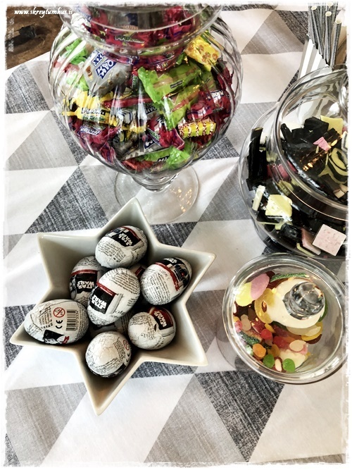 …ég notaði síðan glerkrukkur sem ég átti fyrir undir sælgæti, og auðvitað lakkrís í svarta þemalitinum (best að kaupa bara kílóa afgangana í Góu í Hafnarfirði)…