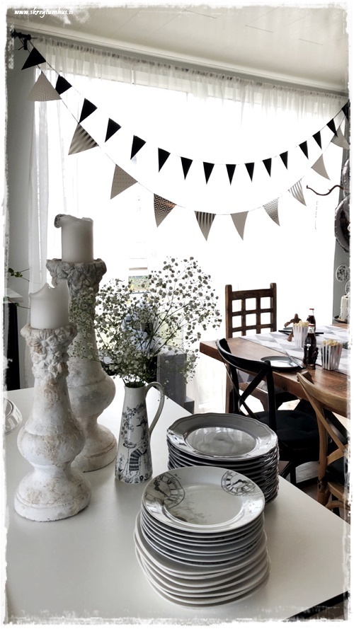 …sama með fánaveifurnar og þessar silfruðu og hvítu þarf að þræða sjálfur á band, ég notaði svart og skipti í tvennt þannig að ég gæti haft yfir borðinu líka…