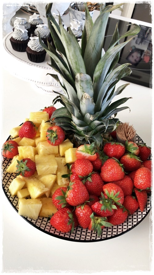 …ananas og jarðarber, og svo tannstönglar til þess að stinga í. Ég nota alltaf toppinn af ananasinum til þess að skreyta með…