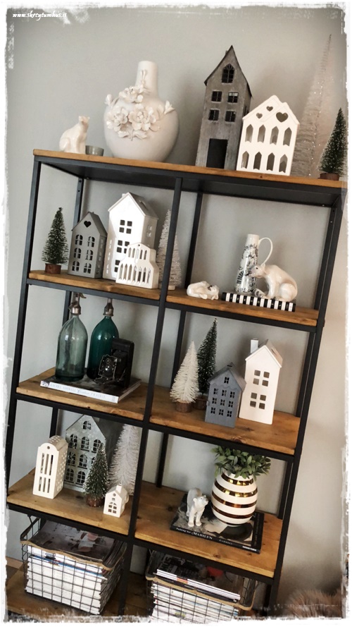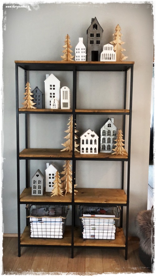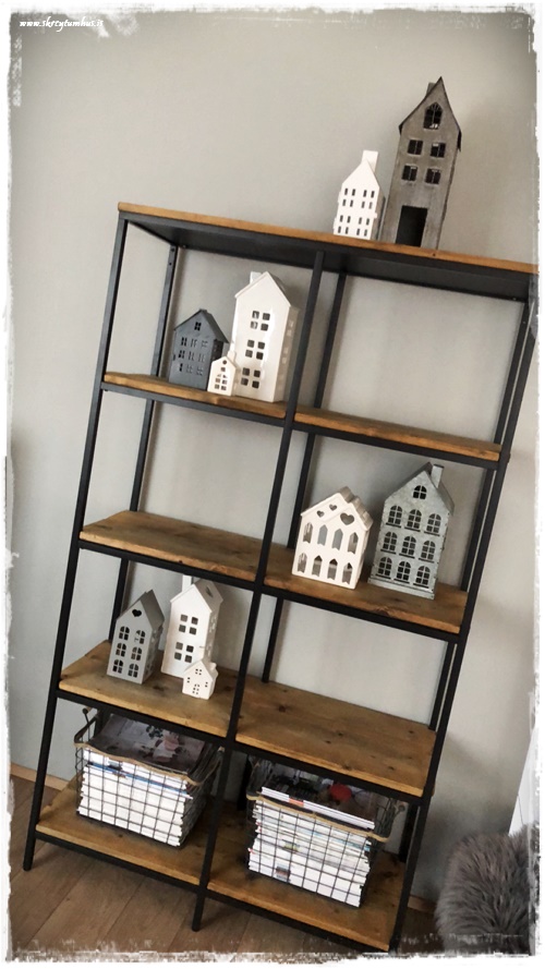 …jújú, einn kassi er fullur af húsum og upp fóru þau. Þið sjáið svona hvað ég er að reyna að gera. Ég para saman hvítt og grátt hús, auðvitað eru það stærðirnar sem stjórna aðeins. T.d. er húsið efst langhæðst, og það verður að vera efst. En í það minnsta þá ákvað ég að para þeim svona núna. Það væri líka hægt að vera með hvít í einni hillu, grá í næstu, og svo aftur hvít – þannig að þið skiljið…