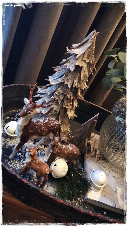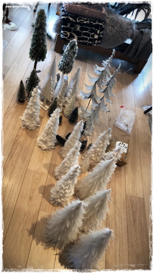 …þar sem mér fannst of mikið vera í gangi með viðartrjánum, þá ákvað ég að deila safninu mínu af burstatrjám þarna inn í. Ég setti bæði hvít og græn tré…
