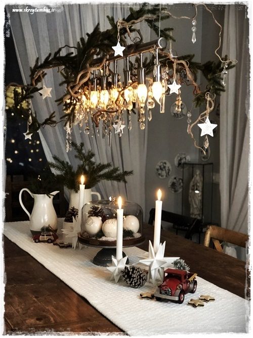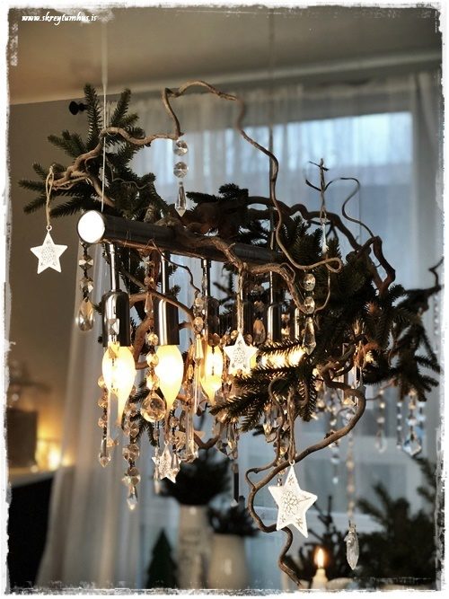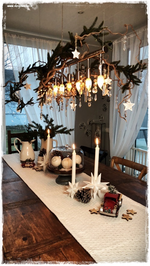 …ég setti gamlar gervilengjur úr Ikea á krónuna okkar, en stjörnurnar eru gamlar frá Rúmfó – en ég held að þær fáist ennþá…