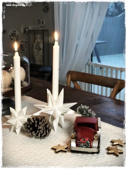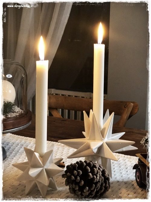 …ég er líka endalaust og botnlaust spurð út í stjörnustjakana mína fallegu.  En ég keypti þá fyrir ansi löngu síðan í A4, og þeir eru frá Bloomingdale-merkinu að mig minnir.  Það fengust svipaðir í Fakó, en mér sýnist þeir ekki vera til í netverslun…