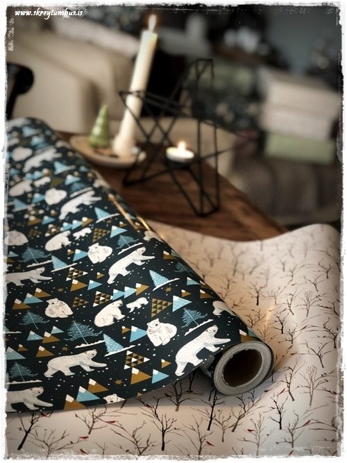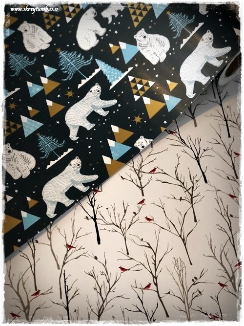 …ég var mjög hrifin af pakkasnærinu sem kemur á svona kefli (sjá hér – smella), en það er svo fallegt bara til skrauts. Stjörnurnar eru alltaf í uppáhaldi, en þær eru 6 stk í pakka og eru svo tímalausar og fallegar (sjá hér – smella). Pastelpappírinn er líka sérlega fagur. Fölbleikur og fölgrænn, og með svo fallegu mynstri…