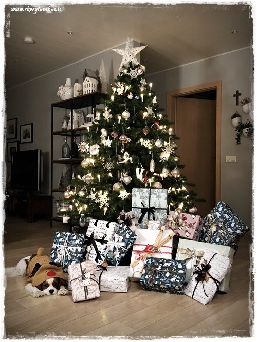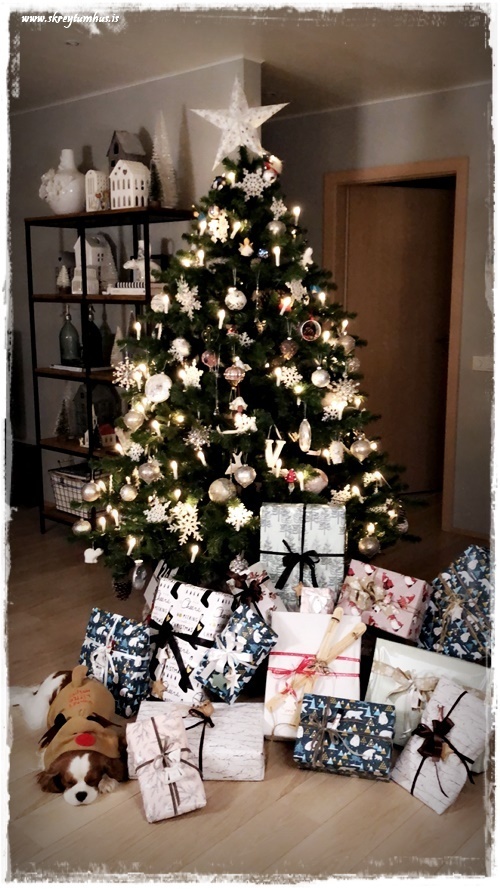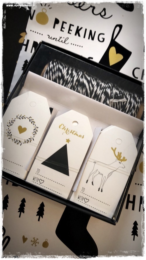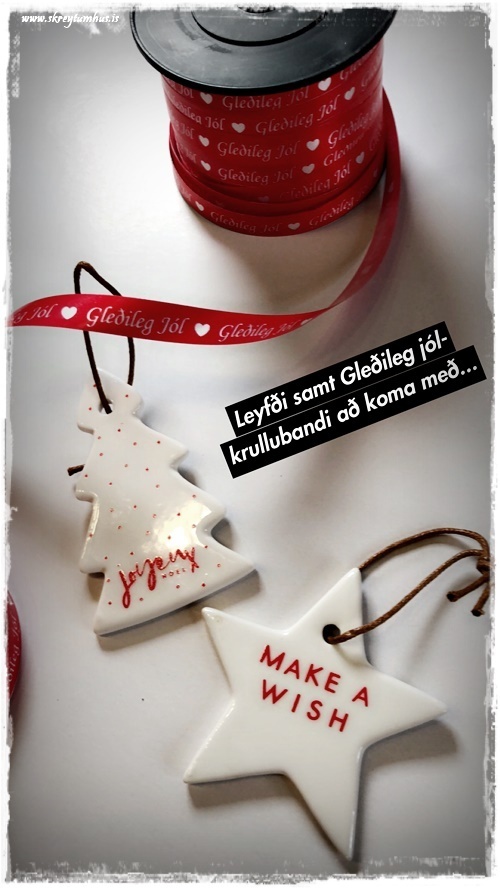 …ég er reyndar alls ekki mikið fyrir krulluböndin, en þetta fannst mér fallegt þar sem það stendur Gleðileg jól (sjá hér – smella) á því. Leyfði því að fljóta með og Elle-skrautið með rauðum texta (sjá hér – smella) er æðislegt með…