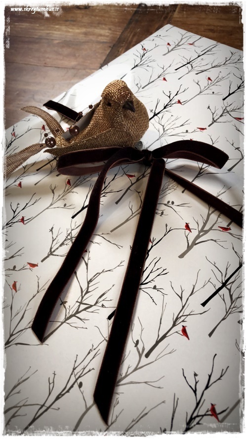 …þetta er held ég uppáhaldspappírinn minn í ár, hvítur með fínlegum trjám og svo litlir fuglar á greinum. Þess vegna fannst mér fallegt að vera með velúrborða í brúnu með, og svo bara einn fallegan fugl (sjá hér – smella)…