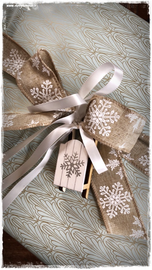 …pastel pappír og grófiur borði með vír í kantinum, sem gerir svo auðvelt að beygja hann (sjá hér – smella). Smá hvítur satín borði með og lítill sleði. Nett snjókornaþema í gangi hér…
