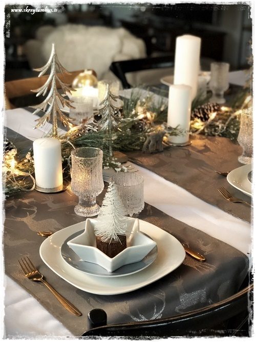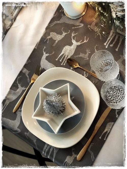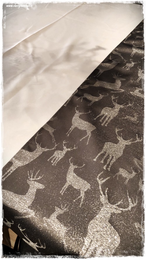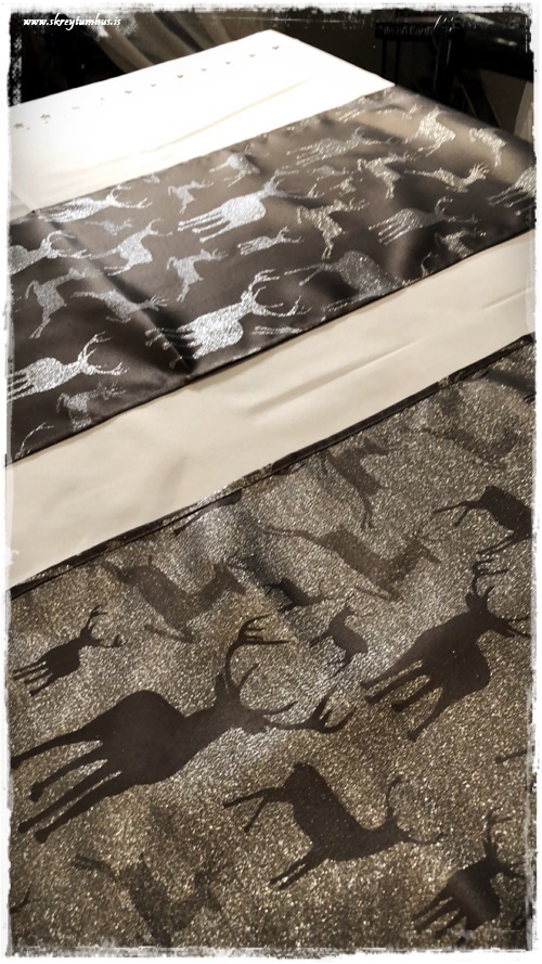 …það virkar síðan eins og dúkurinn sé blettóttur, en þetta er bara skuggar af greinunum í ljósakrónunni.  Ég valdi síðan grábrúna löbera, sem voru með hreindýramynstri…