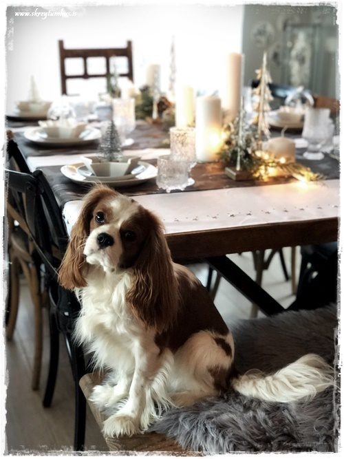 …eftir miðju borðsins lagði ég síðan eina fallega grenilengju frá Blómaval, sem er með áföstum snjó, könglum og meira segja smá steinum…