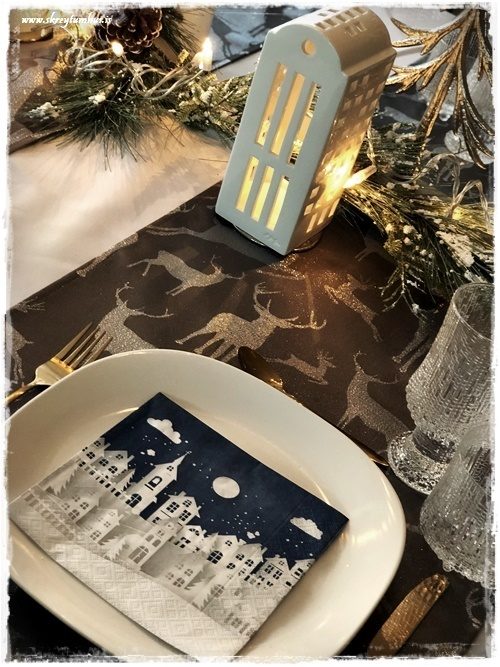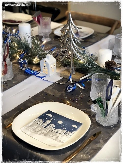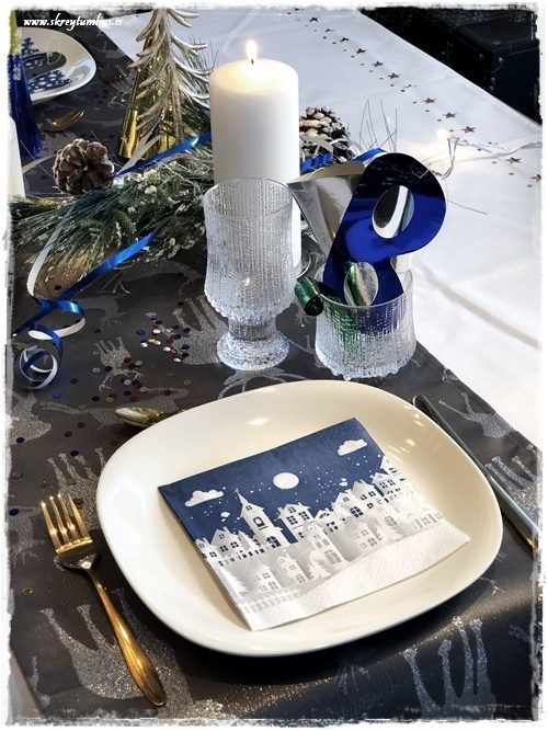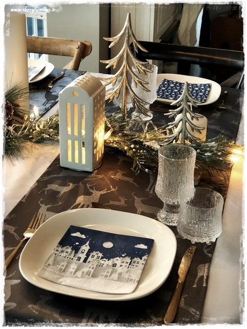 …geggjaðar með bláum stjörnuhimni og húsum.  Þá er líka svo gaman að taka t.d kertahús, eins og ég geri hérna, og setja með á borðið.  Tengja saman servétturnar og skreytingarnar! Ég veit, ég gæti mögulega verið að ofhugsa skreytingar svona almennt…